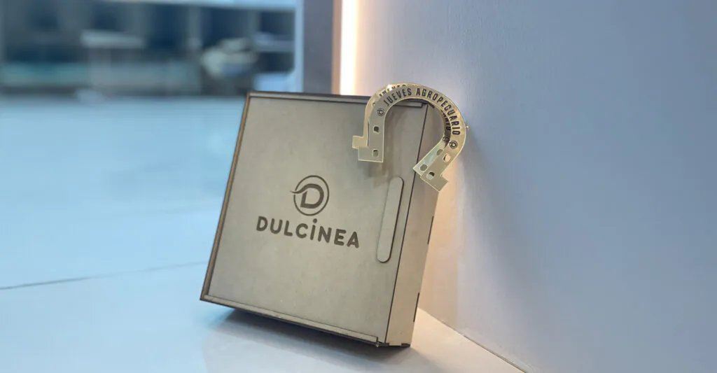 Adicionalmente, se desarrollaron petacas metálicas en acabado mate negro, personalizadas con el logotipo de Dulcinea en grabado dorado de alta definición