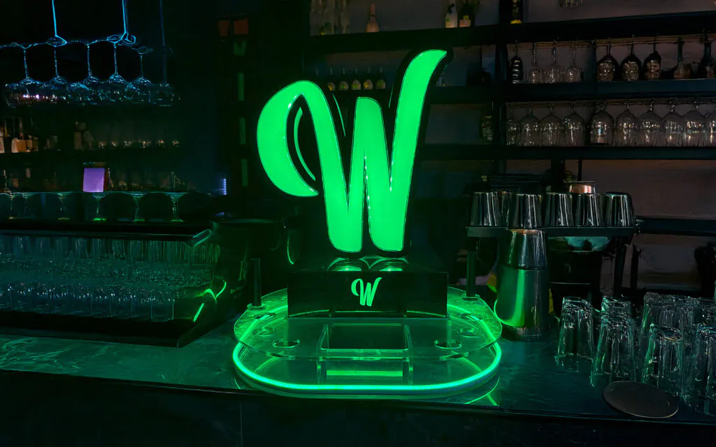 Incluye sistema de iluminación LED incorporado, que potencia visualmente los contornos del diseño central y de la base, generando un efecto luminoso envolvente, ideal para ambientes nocturnos como bares o discotecas.