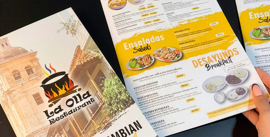 Carta menú elaborada en un formato de 21,5 x 33 cm, impresa en cartulina cote de 350 gramos, lo que le proporciona una estructura rígida, firme y de gran durabilidad. Su confección incluye un proceso de sanduchado que refuerza la rigidez y mejora el acabado final, aportando una sensación de solidez y calidad premium al tacto. La superficie está protegida con un laminado mate que realza los colores sin generar brillos molestos, además de proteger el impreso contra la humedad, el roce y el desgaste propio del uso frecuente en ambientes de restaurante.