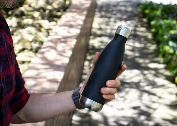 Botella en acero doble pared con tapa rosca. Evita la condensación y aísla las bebidas calientes, ideal para insertar cubos de hielo pequeños y evitar goteos, mantiene las bebidas frías por 24 horas y las bebidas calientes por 12 horas. Capacidad 470 ml. /16 oz.