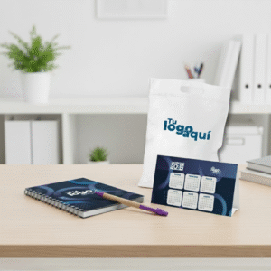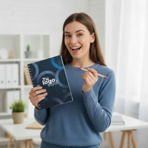 - Cuaderno pasta dura 14×21 cm, guardas full color, interior personalizado a 1 tinta,
