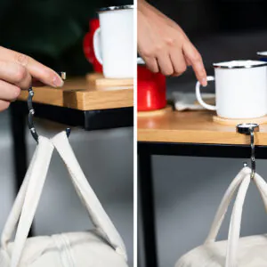 Anillo metálico porta bolsos, práctico y compacto. Diseñado para colgar bolsos de forma segura en el borde de cualquier mesa, manteniéndolos limpios y siempre a la mano.